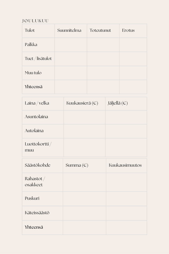 Sisältää kuukausibudjetit, 6 kk säästöhaasteet ja vuoden yhteenvedot – kaikki yhdessä inspiroivassa kirjassa.