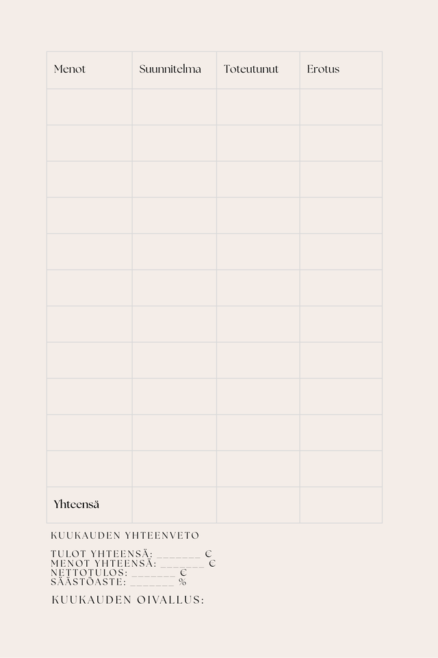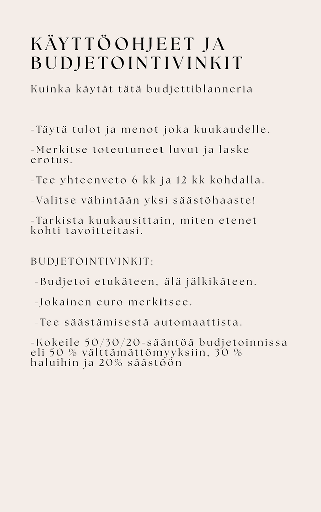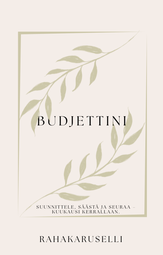 Kaunis ja käytännöllinen vuosibudjettiblanner, jolla seuraat tuloja, menoja ja säästöjä helposti.